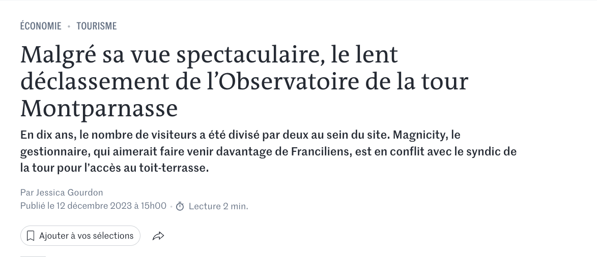 Parlons du Monde, justement, qui a pour habitude de préciser, lorsqu'il mentionne Xavier Niel, qu'il est "actionnaire à titre individuel du Monde". Le 12 décembre, une rubricarde "tourisme" du quotidien se penche sur l'Observatoire de la tour Montparnasse parisienne. Que désertent les touristes, au désespoir de la société gestionnaire Magnicity (elle exploite aussi, entre autres, la célèbre tour de la télévision de Berlin). "En cause : un conflit brûlant, porté devant le tribunal de Paris, entre Magnicity et le syndic de la tour", écrit le Monde, la polémique étant surplombée par un projet de rénovation de l'ensemble de la tour et de son parvis.