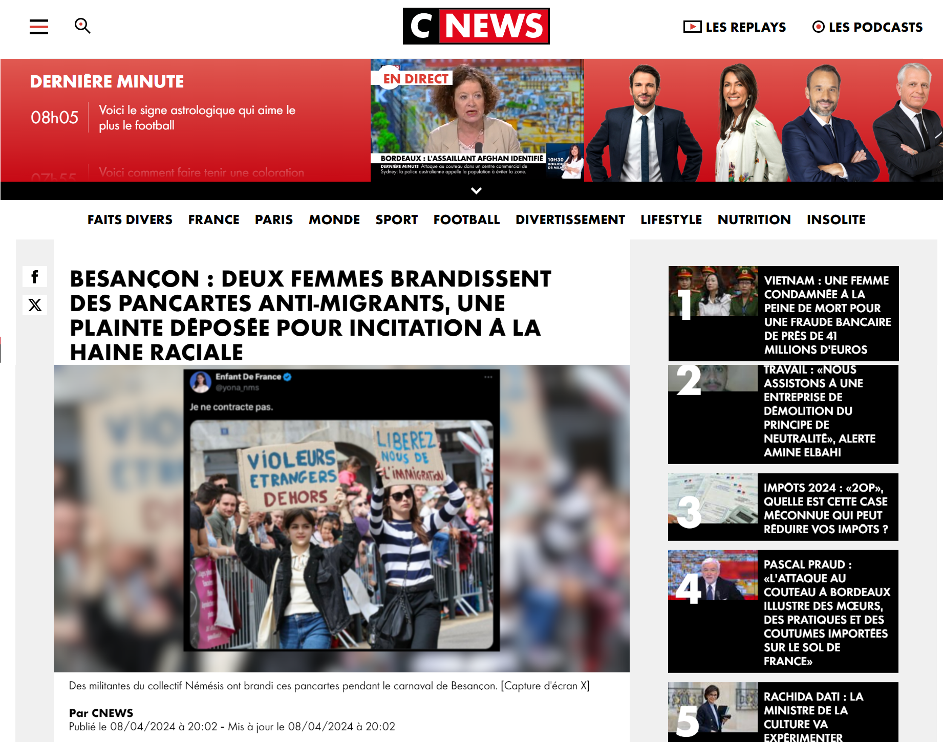 Le carnaval de Besançon bat son plein, ce dimanche 7 avril, lorsque deux militantes du collectif Némésis, qui se prétend "féministe identitaire" mais est surtout d'extrême droite, s'incrustent dans les célébrations, brandissant des pancartes aux relents zemmouriens : "Violeurs étrangers dehors", "Libérez-nous de l'immigration". Elles défilent jusqu'à la tribune officielle.