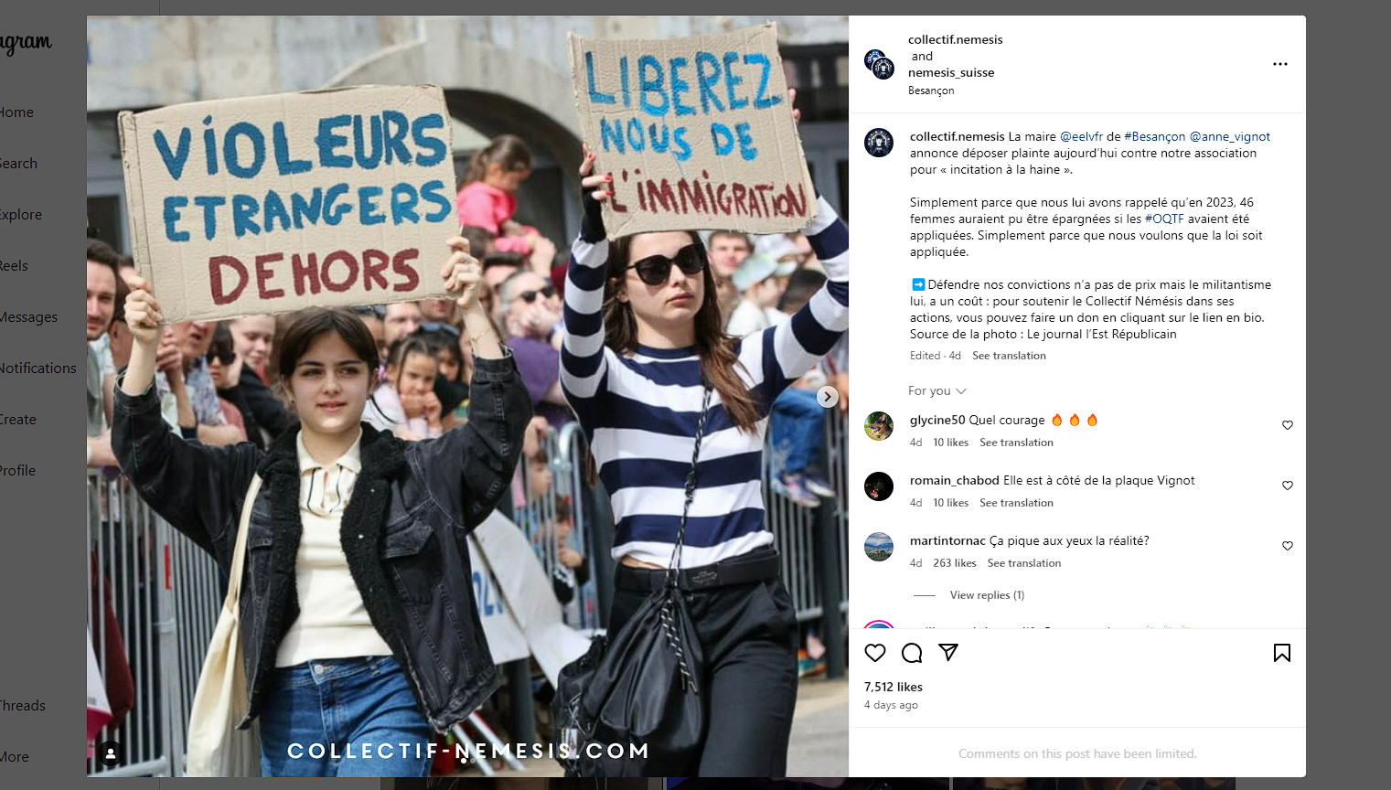 Le collectif reposte cette photo sur son compte Instagram, en y ajoutant un lien vers le site de Némésis, et sans aucun crédit pour l'Est républicain, d'où provient la photo. (Son post a depuis été modifié pour indiquer "Source de la photo : Le journal l'Est Républicain".)
