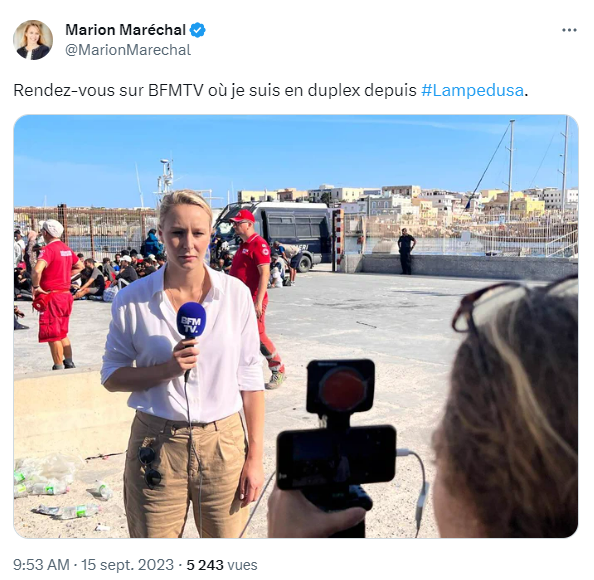 "Rendez-vous sur BFMTV où je suis en duplex depuis Lampedusa." Ce n'est pas une reporter de la chaîne d'info qui tweete ce message (supprimé quelques heures plus tard sans explication, ndlr). Mais Marion Maréchal, personnalité politique d'extrême droite, vice-présidente du parti Reconquête d'Éric Zemmour, dont elle est tête de liste pour les élections européennes. La nièce de Marine Le Pen pose en photo : on la voit se tenir debout, face à une caméra, dans le port de Lampedusa, habillée d'un pantalon beige et d'une chemise blanche. Si l'on ne connaît pas son visage, on la croirait journaliste en reportage, envoyée spéciale sur place par la chaîne de télévision : elle tient un micro à la bonnette bleue estampillée BFMTV et regarde droit vers l'objectif.