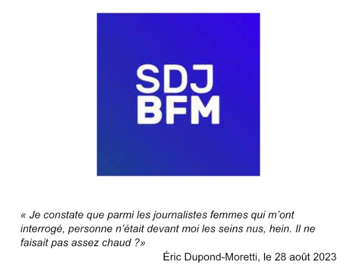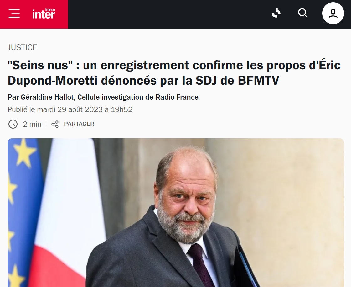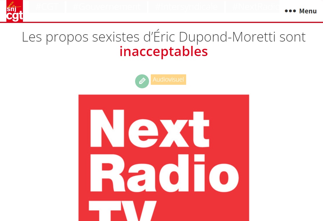 "Les propos sexistes d'Éric Dupond-Moretti sont inacceptables", s'est également indignée l'intersyndicale de NextRadioTV (qui rassemble BFMTV, RMC et les autres médias du groupe Altice) dans un autre communiqué. "Ces propos, témoignant d'un sexisme crasse, ne sont pas acceptables, d'autant plus de la part d'un ministre d'État." Surtout, les trois syndicats soulignent un point que n'abordait pas la SDJ : "L'intersyndicale s'interroge sur le choix de notre direction de ne pas diffuser ces images sur nos antennes."