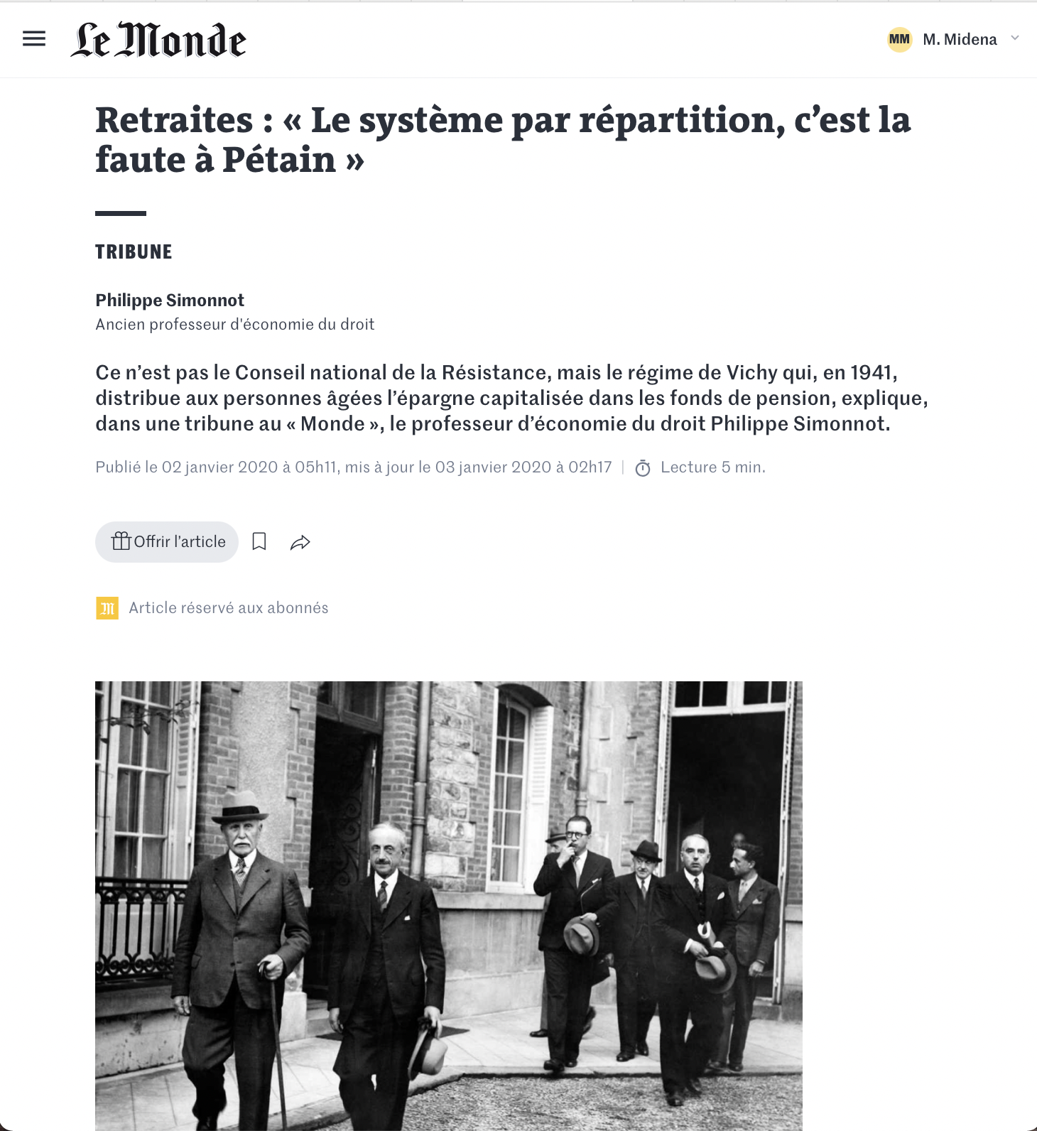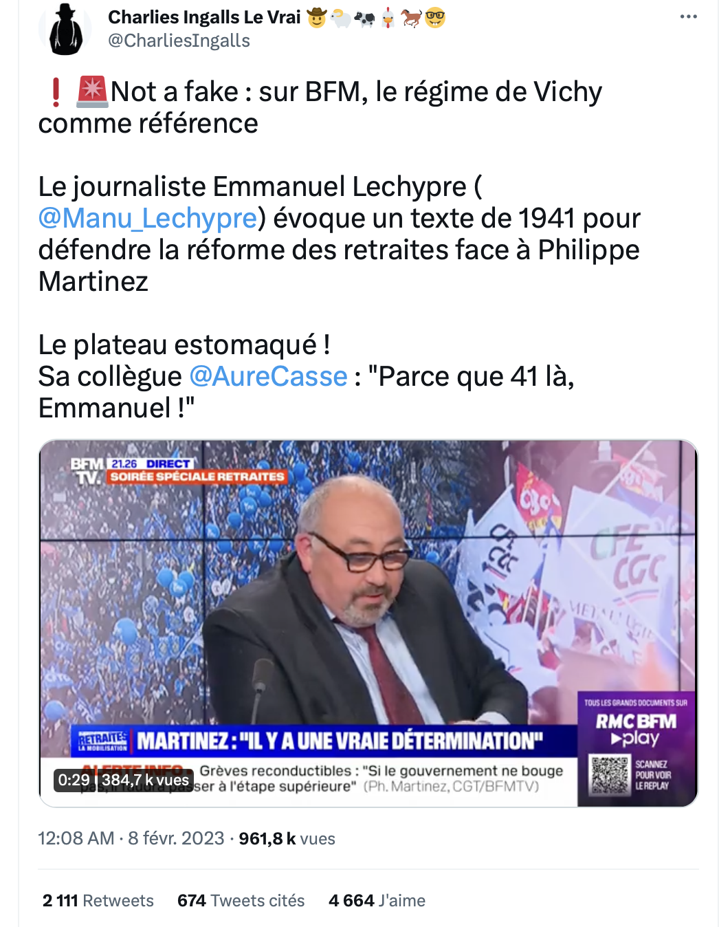 Depuis ce matin, Emmanuel Lechypre prend un sacré bouillon. Le gaillard éditocrate de BFMTV a voulu citer Vichy, et quand on s'appuie sur Vichy en France pour assoir un raisonnement, ce n'est jamais très heureux. On est sur BFMTV donc, mardi 7 février, il est 21 h 27, Philippe Martinez, patron de la CGT est là. Ce qui donne cet extrait vu plus de 900 000 fois. Lechypre lance à Martinez : "Bah moi je vous lis ce qu'il y a écrit dans la loi du 14 mars 1941, la loi sur la répartition." 1941 ? "J'étais pas né", pique Philippe Martinez, patron de la CGT. Mais Lechypre tient à citer le texte : "Lorsque le nombre des retraités croit avec l'élévation de l'âge moyen de la population, le service massif des pensions impose un fardeau insupportable aux éléments productifs." Moment de flottement. Martinez reprend : "Je pense que la France était pas dans son meilleur état… Vous avez le droit de prendre des références de Vichy, mais…" La présentatrice, Aurélie Casse, ne cache pas non plus son malaise : "Oui parce que 41, Emmanuel…"