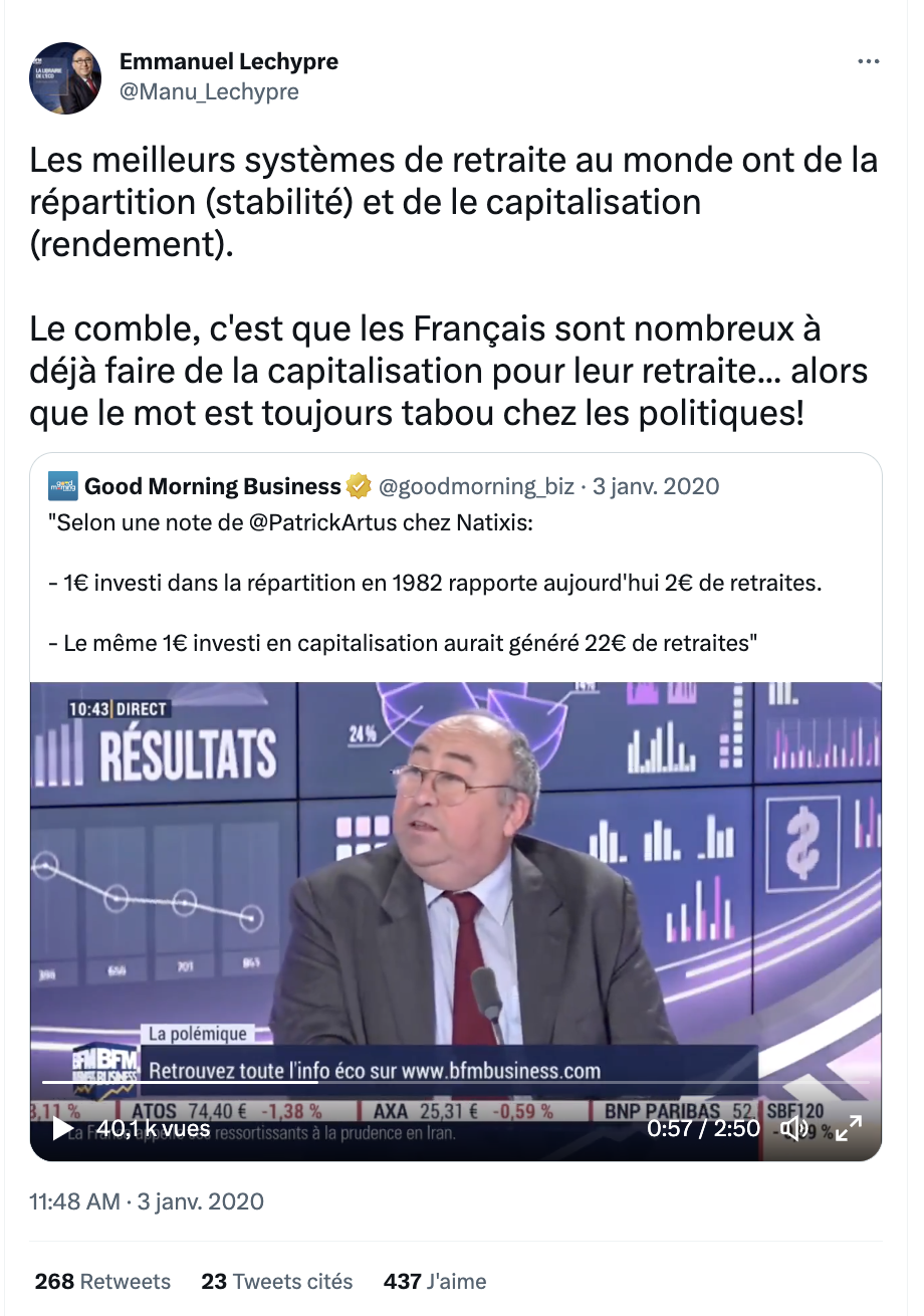 Mais Lechypre a une autre idée derrière la tête, comme le montre le reste de la séquence, non diffusée sur Twitter. Ce qu'il défend, lui, c'est la capitalisation, comme quand il demande à Martinez : "La capitalisation au sens collectif (sic), c'est quelque chose qui vous paraît inconcevable ?" La capitalisation, le journaliste la défendait déjà en 2020 sur le plateau de BFM Business.