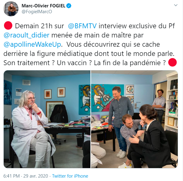 Un entretien exclusif d’une heure avec le professeur Didier Raoult. Voilà ce que nous promettaient sur Twitter, mercredi 29 avril, Marc-Olivier Fogiel, le directeur général de BFMTV, et Apolline de Malherbe, intervieweuse-star de la chaîne.