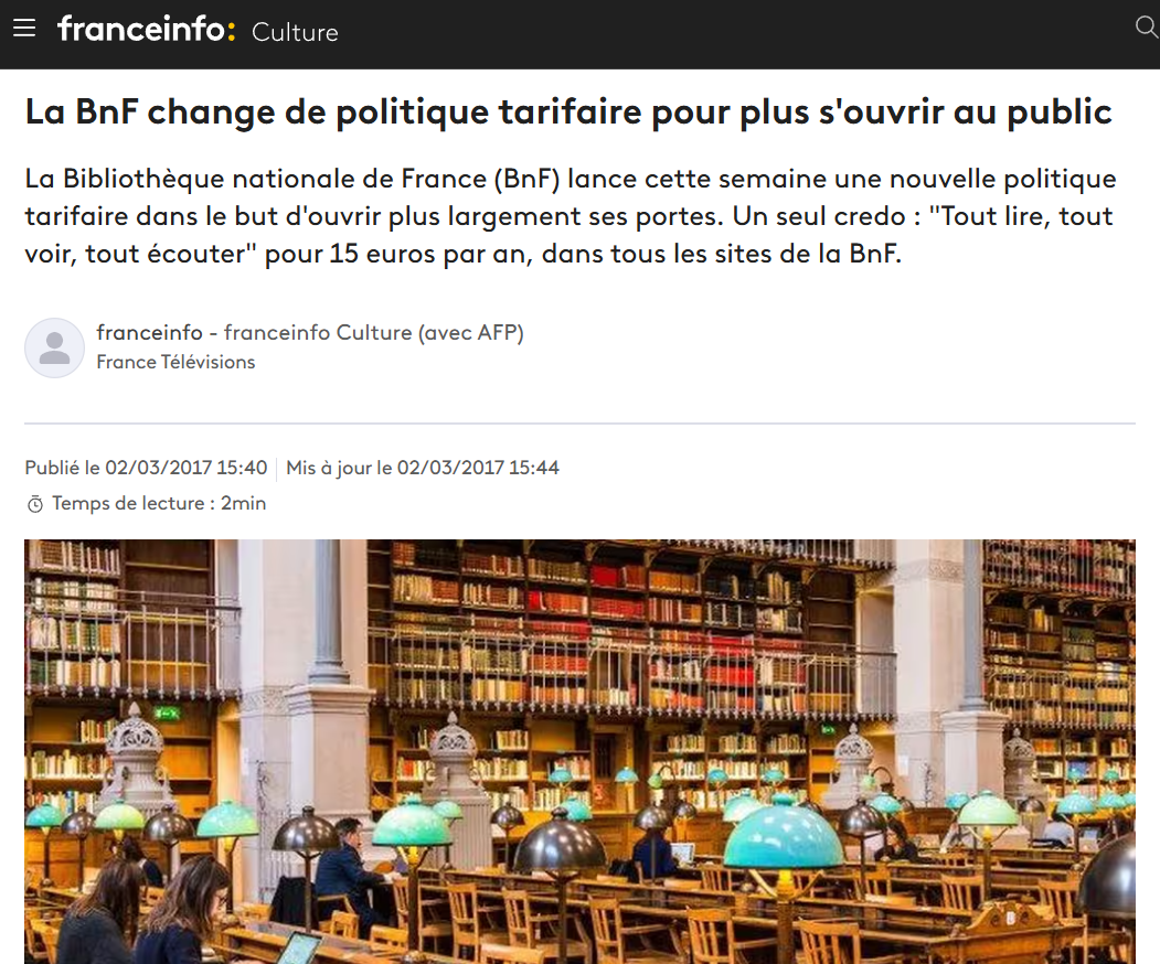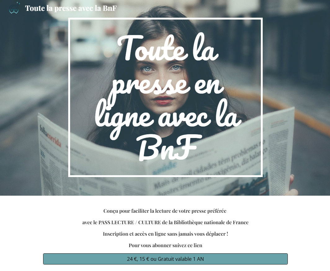 Depuis 2020 et l'irruption du Covid-19, la Bibliothèque nationale de France a renforcé de manière très importante les accès à distance proposés dans le cadre de son abonnement commun, nommé "pass BNF lecture / culture" et lancé sous cette forme en 2017 (avec alors une dépêche AFP). Ces accès à distance permettent aujourd'hui aux 82 000 abonné·es – un quart au plein tarif annuel de 24 euros, un quart gratuitement, la moitié au tarif réduit de 15 euros – de consulter une grande partie de l'offre payante de la presse française, y compris des médias indépendants comme Arrêt sur images ou Mediapart, mais aussi des titres internationaux tels que le New York Times.