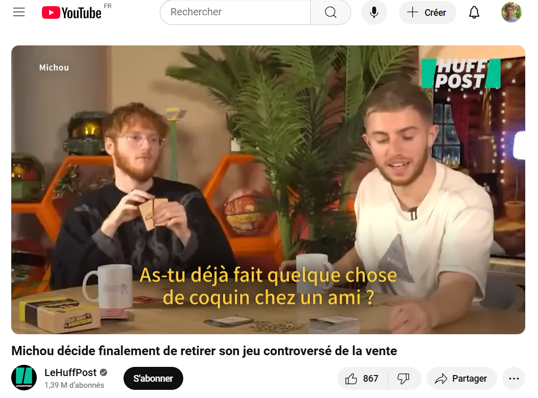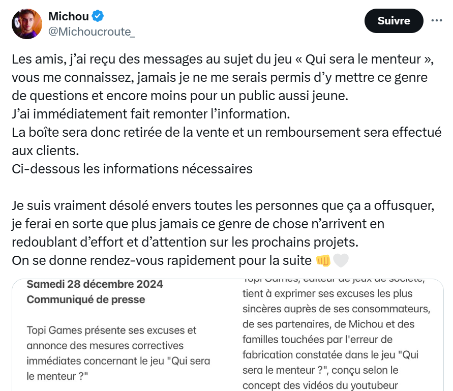L'entreprise de jeux de société Topi games promeut de longue date ses jeux par l'intermédiaire d'opérations commerciales avec des vidéastes sur YouTube, et a aussi décliné des "jeux de sociétés de youtubeurs" ces dernières années. Fin 2024, Michou, 10 millions d'abonné·es et plusieurs opérations avec Topi games au compteur, a annoncé le lancement pour Noël de son propre jeu de société, Qui sera le menteur, avec une vidéo autopromotionnelle sur sa chaîne. Le problème est devenu apparent à Noël, lorsqu'a émergé sur les réseaux sociaux un fait troublant : ce jeu promu à partir de 7 ans sur la boîte comporte parmi ses questions des propositions à caractère sexuel ou en rapport avec les stupéfiants. Tollé.