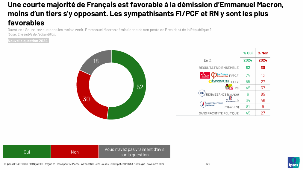 L'Ifop est-elle le seul institut de sondage à refuser de poser à son panel la question de la potentielle démission d'Emmanuel Macron ? Faisons le tour des autres sondeurs : "Souhaitez-vous que dans les mois à venir, Emmanuel Macron démissionne de son poste de Président de la République ?", a demandé Ipsos en novembre 2024. Il n'est pas le seul, puisque la question a aussi été posée, ces dernières semaines, par Toluna Harris interactive pour RTL, par Elabe pour BFMTV, mais aussi par Odoxa pour le Figaro, par CSA pour les médias du groupe Bolloré auquel il appartient, et par Cluster17 pour le Point. Un seul autre institut de sondage n'a pas posé la question, en l'occurrence OpinionWay (qui n'a pas souhaité commenter la chose auprès d'ASI), propriété du groupe Les Échos - Le Parisien. Deux quotidiens dont les journalistes politiques se sont fait l'écho de sondages d'autres instituts.