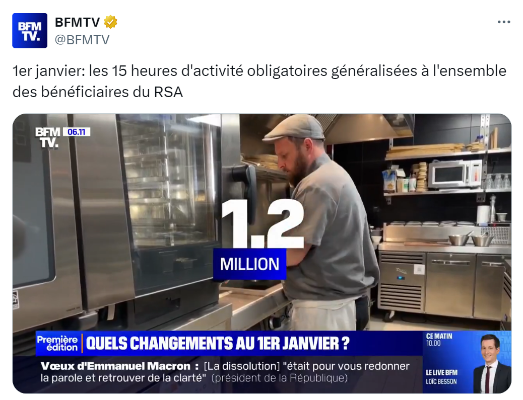 Ces trois reportages diffusés par BFMTV, RMC et France 2 pour la nouvelle année à propos de la réforme du RSA contiennent la plupart des éléments des récits médiatiques à son propos : un allocataire heureux d'avoir retrouvé du travail suite à l'expérimentation menée dans quelques départements. Les propos gouvernementaux et de la direction de France Travail (enthousiastes et rassurants). Un atelier de motivation afin de conserver son RSA. Les inquiétudes des associations accompagnant les allocataires dont ils observent la hausse des non-recours aux aides, et les inquiétudes d'une allocataire handicapée ne comprenant pas qu'on veuille la forcer contre toute logique à 15 heures minimum d'activité. Le tout surplombé par la possibilité du travail gratuit en entreprise, de radiations massives par les conseils départementaux qui versent le RSA, et d'une ambition politique destinée à appliquer en France un équivalent des funestes lois Hartz IV que vient d'abandonner l'Allemagne.