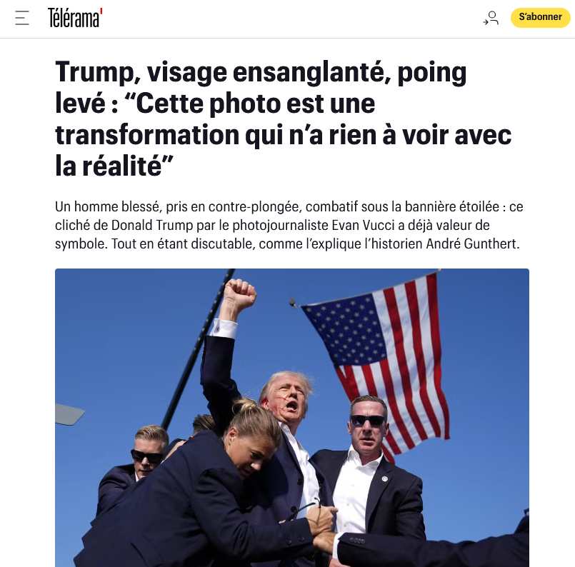 À l'instar de cette critique acerbe et à contre-courant de la photo de Donald Trump venant de se faire tirer dessus, poing levé, entouré des agents du Secret service, sur fond de ciel bleu et de drapeau des États-Unis, prise par le photojournaliste d'Associated Press Evan Vucci. "C'était, selon un consensus immédiat, une image iconique. Et elle a immédiatement changé le récit. L'homme est soudain devenu un héros, écrit l'universitaire. En réalité, bien sûr, rien n'avait changé. La photo était seulement de la propagande déguisée en journalisme. Parce que cette photo est une composition, le résultat d'une coopération intuitive entre Donald Trump et le photojournaliste. Elle montre Trump exactement comme il l'aurait voulu : fort et invincible."