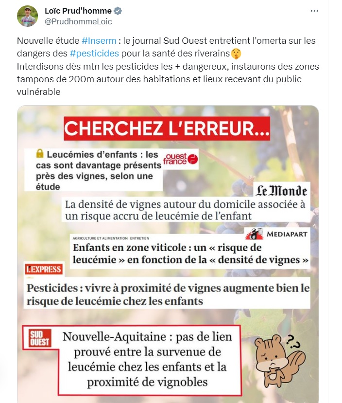En octobre, une étude de l'Institut national de la santé et de la recherche médicale (Inserm) montre que dans une partie des régions françaises, certaines leucémies infantiles croissent à proportion de la densité de vignes autour du domicile des enfants. Les médias nationaux relaient très largement (par exemple le Monde, Reporterre, BFMTV, Libération, l'Express, le Figaro) les résultats de cette étude, pour laquelle l'Inserm avait proposé un communiqué et une conférence de presse. Les médias locaux aussi s'en emparent, en particulier dans les régions viticoles. Y compris Sud Ouest, dont le premier titre de l'article, "Pas de lien prouvé entre la survenue de leucémie chez les enfants et la proximité de vignobles", déclenche l'ironie du député LFI Loïc Prud'homme qui réclame l'interdiction des pesticides les plus dangereux et des zones tampon de 200 m autour des habitations.