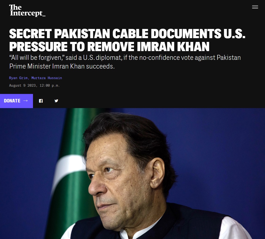 Élu en août 2018 premier ministre du Pakistan grâce au soutien des militaires, Imran Khan a été renversé par une motion de censure en avril 2022, puis arrêté et emprisonné pour corruption en août 2023. En juin de cette année, il accusait dans The Intercept les militaires pakistanais d'avoir manipulé les États-Unis, allié historique (avec des hauts et des bas) du Pakistan, pour soutenir sa chute. Ce 9 août, une enquête du site d'investigation révèle, grâce à l'obtention de câbles diplomatiques pakistanais, qu'un diplomate états-unien a fortement appuyé la motion de censure, en raison de la neutralité d'Imran Khan autour de la guerre en Ukraine. Des révélations que n'a pas reprises le New York Times… il faut dire que son correspondant au Pakistan a publiquement jugé l'information de peu d'intérêt, tout en assurant que la source des documents de The Intercept était probablement le parti de l'ancien premier ministre – engendrant de farouches démentis des journalistes de The Intercept.