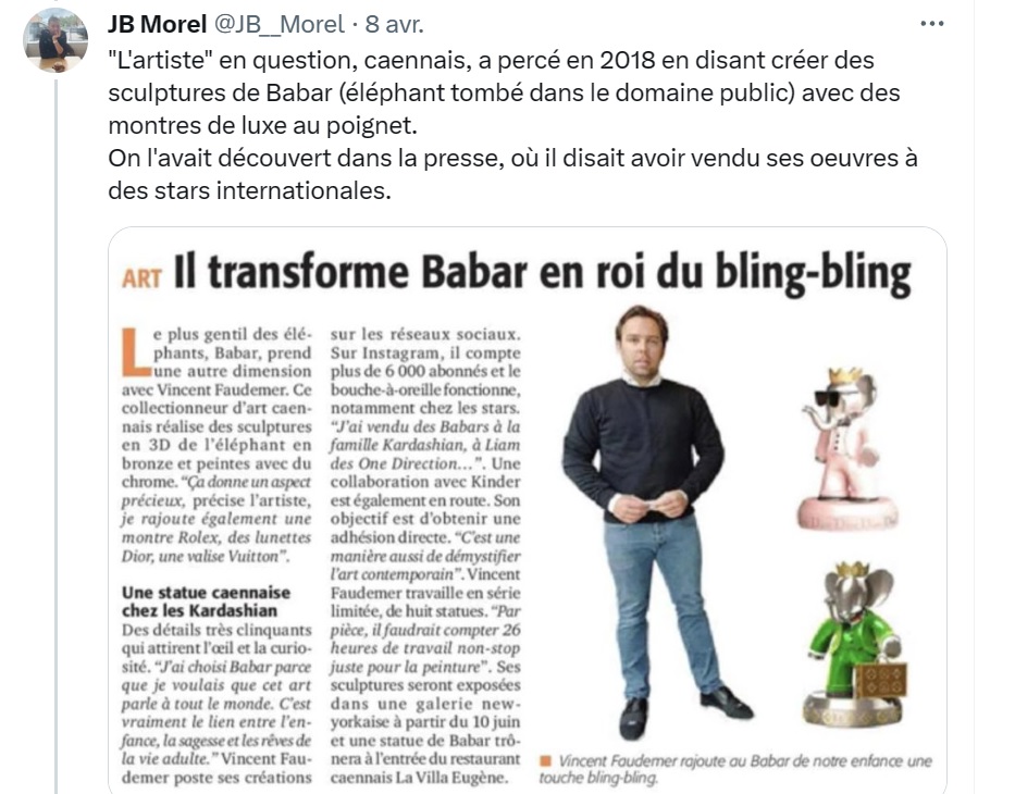 ), Jean-Baptiste Morel, et l'ex-journaliste chargée de couvrir initialement le bonhomme, Manon Loubet. Il faut dire que Faudemer assurait que ses statuettes d'un Babar revisité à coup de Rolex étaient achetées par les plus grandes stars. Si, à l'époque, le pure player local de Publihebdos en Normandie, n'obtenant que des démentis des stars et institutions que Faudemer mettait en avant (et apprend qu'il avait des ennuis avec le fisc), en vient à ne rien publier, d'autres médias locaux mettent l'homme en lumière.