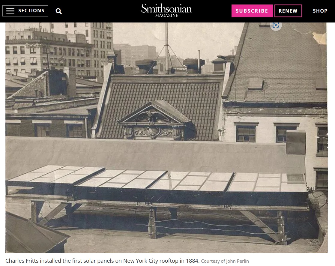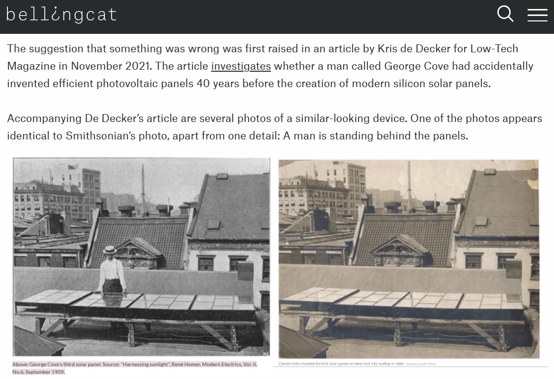 Au cœur de l'été, le média spécialiste de l'enquête en sources ouvertes Bellingcat s'est penché sur le mystère de l'invention des premiers panneaux photovoltaïques de toit. Ou plus précisément, sur une photo : celle des "premiers panneaux solaires" installés sur un toit de New York par l'inventeur Charles Fritts, présente au sein d'un publireportage publié dans le Smithsonian Magazine, écrit par deux salarié·es du bureau des brevets des États-Unis.