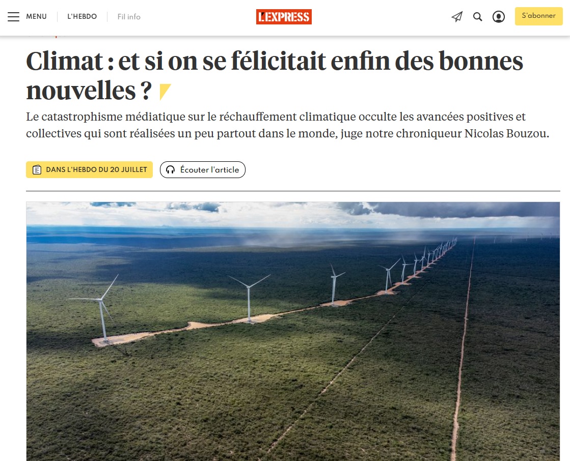 Le 16 juillet dans sa chronique de l'Express, Nicolas Bouzou (celui-là même dont la rémunération par Uber a été dévoilée dans le cadre des "Uber Files") a enjoint à se féliciter des "bonnes nouvelles" concernant les décisions politiques mondiales concernant le dérèglement climatique. Si on doit résumer : tout va dans la bonne direction, les centrales à charbon vont fermer, les prix du photovoltaïque et de l'éolien sont en chute libre. "Cessons de croire ceux qui affirment que rien n'est fait pour lutter contre le réchauffement et que les gouvernements ne prennent pas le problème au sérieux. Le monde va peut-être même réussir à relever un défi historique, existentiel. C'est enthousiasmant !", conclut-il.