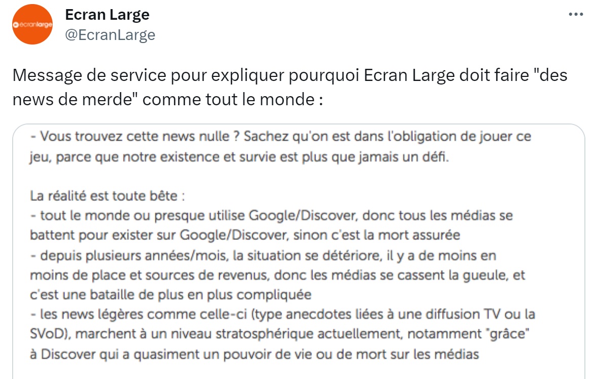 Mon attention a été attirée lorsqu'au mois de juillet, je croise ce "message de service", publié par le média culturel Écran Large sur Twitter, autant que sous certains de ses contenus. On peut y lire que "tout le monde ou presque utilise Google/Discover, donc tous les médias se battent pour exister sur Google/Discover, sinon c'est la mort assurée", explique la rédaction à propos de l'incontournable moteur de recherche et de son application mobile de sélection d'actualités. Or "depuis plusieurs années/mois, la situation se détériore, il y a de moins en moins de place et sources de revenus, donc les médias se cassent la gueule, et c'est une bataille de plus en plus compliquée". Donc : "Les news légères comme celle-ci marchent à un niveau stratosphérique actuellement, notamment «grâce» à Discover qui a quasiment un pouvoir de vie ou de mort sur les médias."