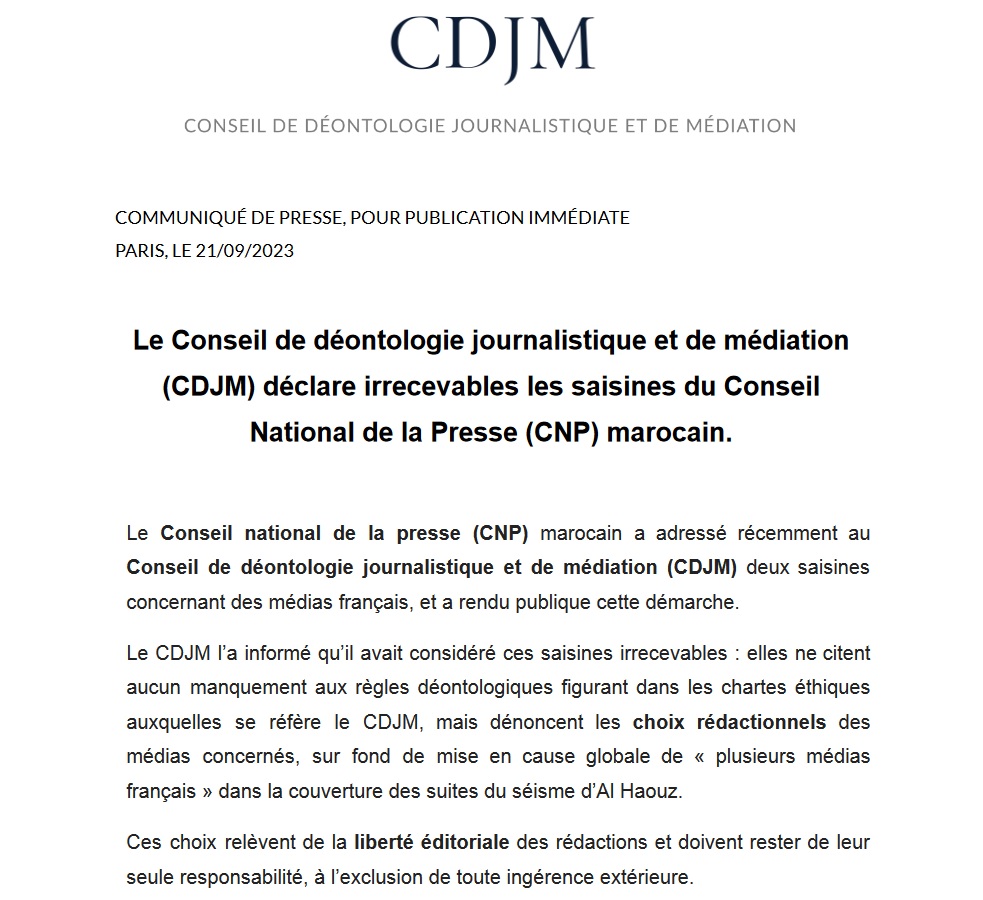 que celle de Charlie Hebdo – qui a répondu en qualifiant le Syndicat nationale de la presse marocaine de "bon chien de garde du pouvoir royal". Dans un communiqué, le CDJM a sèchement déclaré "irrecevables" les saisines du CNP. "Elles ne citent aucun manquement aux règles déontologiques figurant dans les chartes éthiques auxquelles se réfère le CDJM, mais dénoncent les choix rédactionnels des médias concernés, indique l'association française. Ces choix relèvent de la liberté éditoriale des rédactions et doivent rester de leur seule responsabilité, à l'exclusion de toute ingérence extérieure. Le CDJM, attentif au respect de la déontologie et à la liberté de la presse, s'interdit de porter des jugements sur ces choix." Rejet dont les médias marocains n'ont pas fait part.