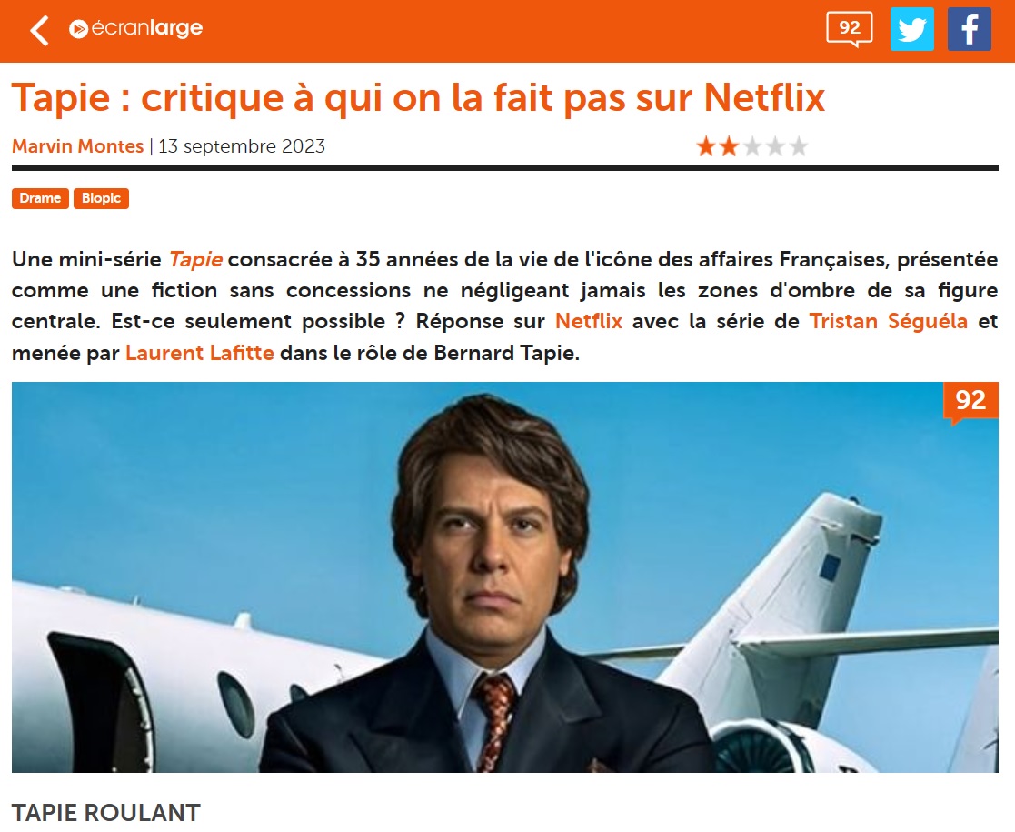 accorde deux "T" à la série, son spécialiste ès séries Pierre Langlais estime au contraire que Tristan Séguéla "fait de son Tapie une victime et un bourreau, un capitaliste cynique et un type généreux", et conclut : "La bienveillance vis-à-vis de «Nanard» prend toujours le dessus, comme si Tristan Séguéla ne pouvait se départir d'une forme de fascination." Même constat pour le média culturel Écran Large : "On ne peut s'empêcher de constater le manque d'honnêteté du projet, qui se refuse systématiquement à nous entrainer vers les territoires les plus sombres de la galaxie Tapie", déplore sa critique. "À l'image de l'entrepreneur-boulet de canon, la série de Séguéla choisit de tout justifier sur son passage, en apportant un étrange contrepoint à chacune des exactions du patron", analyse ainsi l'article. Et puis, il y a Laurent Mauduit, cofondateur de Mediapart, chasseur de Tapie devant l'Éternel avec treize ans d'enquête sur l'arbitrage frauduleux OM-VA. "Netflix a choisi de présenter le Tapie enjôleur, le Tapie certes un peu roublard, mais surtout le Tapie énergique, et presque seulement celui-là. On le déteste parfois, on le trouve gonflé, mais il est tout de même sympathique, très humain, pour tout dire très attachant", écrit le journaliste.