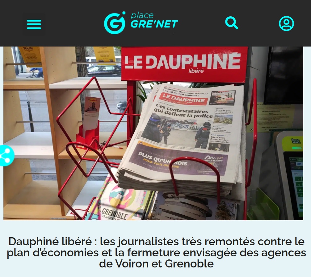sont "très remontés" contre la fermeture envisagée de leurs bureaux, qui accueillent une cinquantaine de salarié·es. Cette fermeture se ferait au profit d'un rapatriement à Veurey, à équidistance des deux communes, au sein du siège du journal qui serait alors réhabilité. "À ce stade, juste une idée" avec "une étude de faisabilité et d'impact", donc "très loin d'une décision voire même d'un projet", précise à Arrêt sur images son directeur général Christophe Victor. Confronté aux premières pertes de l'histoire contemporaine du journal, filiale du groupe Ebra (propriété du Crédit mutuel), il évalue les économies liés au départ du journal de son bureau grenoblois à 300 000, voire 400 000 euros. Le directeur général estime "disproportionné" le mouvement de contestation, qui a abouti ce mardi 26 septembre à la grève d'une trentaine de journalistes, et se demande si cette "surenchère" n'est pas liée aux prochaines élections professionnelles à venir au sein du quotidien. "Le Dauphiné Libéré deviendrait le seul journal de PQR à ne pas disposer de locaux dans la plus grosse ville de sa zone de diffusion", déplore un communiqué du SNJ, le syndicat majoritaire du titre – alors que FO et la CFDT appellent aussi à la mobilisation. "Ces dernières années, le titre de presse a déjà fermé plusieurs de ses agences en Savoie et en Haute-Savoie (Sallanches, Chamonix, Aix-les-Bains…)", rappelle un récent article de France 3 Auvergne-Rhône Alpes.