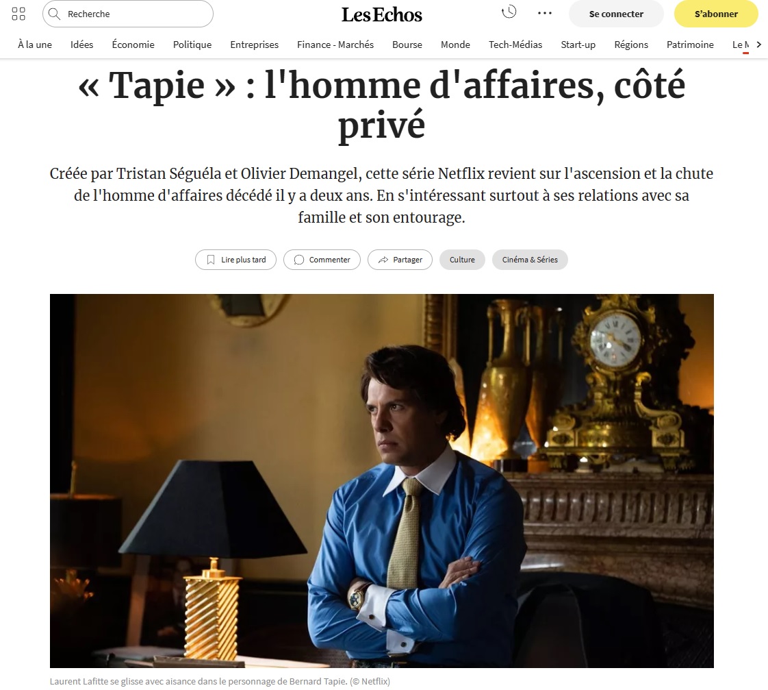 La "série-événement" sur Bernard Tapie diffusée par Netflix a fait l'objet d'innombrables critiques élogieuses dans les médias. Le Monde, dans ses deux articles, et l'interview du réalisateur par BFMTV, ne se prononcent pas. Par contre, les Échos loue les "faits d'armes, rappelés avec prestance par cette série, qui ont construit sa légende et qui dessinent le portrait non seulement d'un ambitieux en quête forcenée de reconnaissance mais aussi celui d'une époque". Le Point
