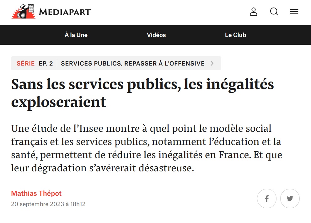 Et puis, il y a Mediapart, avec un récit médiatique à la fois plus précis sur le facteur majeur de redistribution, et divergent dans son titre : "Sans les services publics, les inégalités exploseraient". Son auteur Mathias Thépot explique à ASI