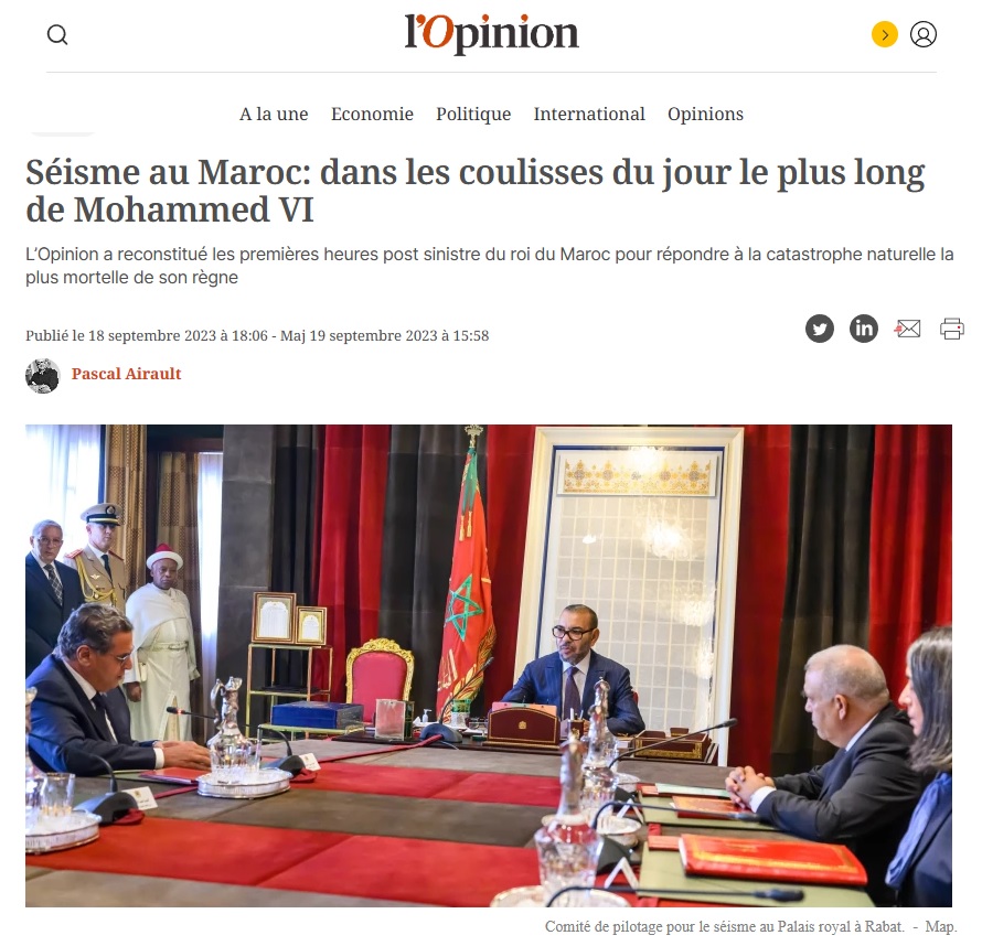 On commence par un compte Twitter, l'un des innombrables jouant le rôle de petit télégraphiste du Royaume chérifien. Plus précisément, en sortant du paywall de l'Opinion les éléments les plus flatteurs d'un article racontant le "jour le plus long de Mohammed VI", c'est-à-dire la manière dont le roi, qui passe une bonne partie de l'année en France et s'y trouvait au jour du séisme, aurait agi de manière rapide et décisive pour les Marocains touchés par la catastrophe. Une forme de réponse aux critiques concernant son absence d'expression publique et de présence sur place les jours ayant suivi le tremblement de terre.