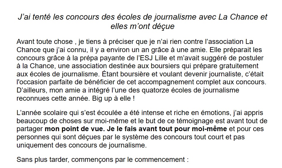 C'est un long cri du cœur, autant qu'une analyse gonzo des concours d'écoles de journalisme, qu'a mis en ligne Laurie Ngarassi la semaine dernière. Elle constatait qu'une fois de plus, les photos de promo des écoles de journalismes manquaient singulièrement de diversité. Après avoir présenté une première fois sans succès les concours d'entrée en école de journalisme, elle s'est remise au travail, en étant cette fois-ci accompagnée par l'association La chance pour la diversité dans les médias (le journaliste d'ASI Maurice Midena en est membre, ndlr). Elle a rejoint la nouvelle antenne bordelaise qui a désespérément essayé de la faire entrer dans les canons de ce qu'est une étudiante en journalisme pour les écoles de journalisme : lisse au point de devoir nier son expérience de personne racisée et socialement moins favorisée que la plupart des candidat·es, afin de ne pas effrayer les jurys.