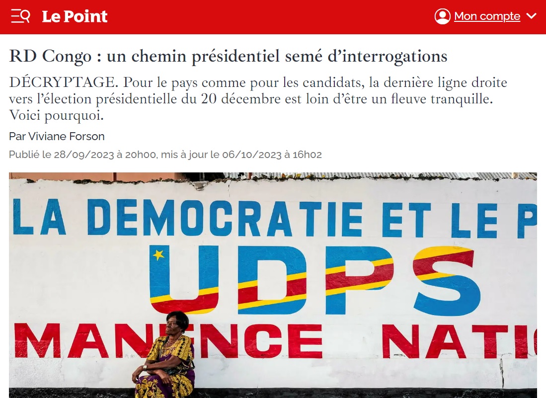 Article dans lequel figurait déjà ce sondage de l'agence Kuna, sans qu'il ne soit précisé, là non plus, son origine probable – Félix Tshisekedi, donc. Suite à l'article de la Lettre, le Point a ajouté la mention suivante dans son texte : "Ces données sont à prendre avec des pincettes, dans la mesure où des doutes existent sur les conditions de réalisation de ce sondage." Jointe par Arrêt sur images, son autrice Viviane Forson assure qu'elle avait simplement reçu un courriel de l'agence Kuna pour mettre en avant ce sondage, dont elle ne connaissait donc pas l'origine, si ce n'est que sa réalisation par l'institut One to One, connu en Afrique, lui avait inspiré une certaine crédibilité. "Je reçois régulièrement des sondages, des informations, on parlait justement de la RDC en conférence de rédaction à l'approche de l'élection, commente-t-elle. J'ai proposé un article en m'appuyant sur ce sondage qui sortait, mais je cite d'autres sondages, je fais intervenir un expert, je compare et je dis ce qui va ou pas en RDC, l'article est équilibré." Viviane Forson rappelle aussi que le second sondage qu'elle évoque, réalisé par l'Institut canadien Léger, l'avait aussi été à l'initiative du pouvoir congolais, ce qu'elle ne précisait pas dans son article : "Ça allait embrouiller les gens, je voulais montrer que rien n'est joué alors que le président a tous les moyens pour lui."