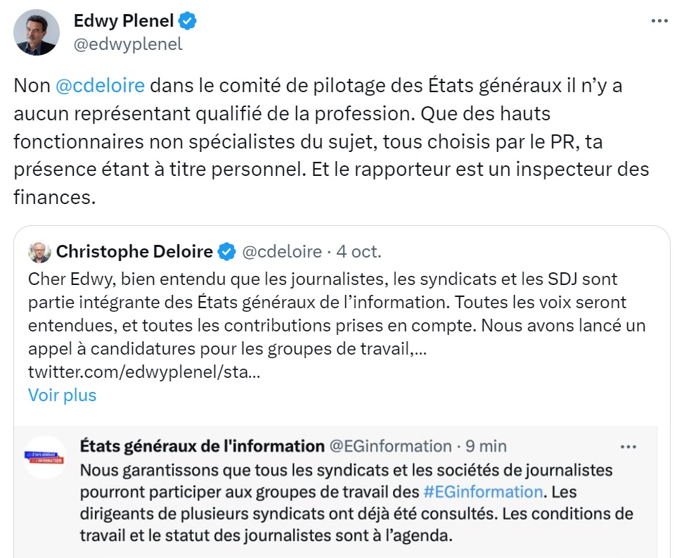 Ce 3 octobre, alors que sont lancés sous l'égide de l'Élysée des États généraux de l'information déjà vivement critiqués par les syndicats de journalistes (qui sont absents de son comité de pilotage), le Fonds pour une presse libre (que chapeaute Mediapart) a annoncé son initiative "pour des États généraux de la presse indépendante". Le relais de cet appel par Edwy Plenel a entraîné la réponse suivante du secrétaire général de Reporters sans frontières Christophe Deloire : "Bien entendu que les journalistes, les syndicats et les SDJ sont partie intégrante des États généraux de l'information. Toutes les voix seront entendues, et toutes les contributions prises en compte. Nous avons lancé un appel à candidatures pour les groupes de travail, et la participation sera ouverte à toutes les organisations." Ce à quoi le cofondateur de Mediapart a notamment répondu : "Non Christophe Deloire dans le comité de pilotage des États généraux il n'y a aucun représentant qualifié de la profession." Sollicité par ASI, Christophe Deloire n'a pas répondu.