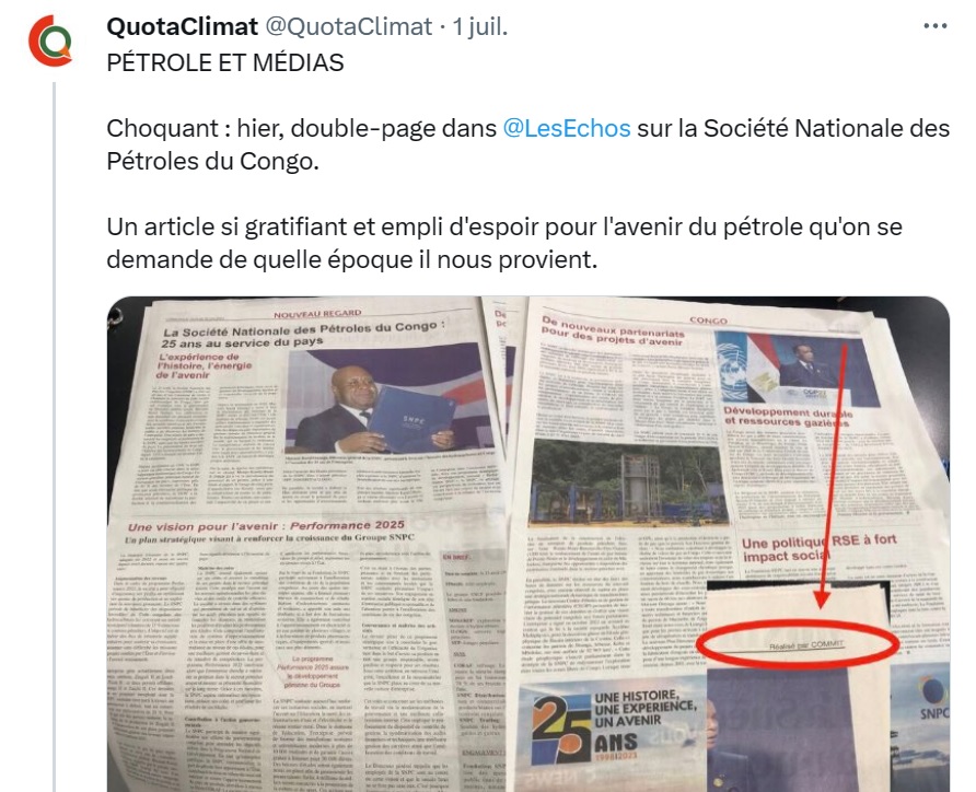 Les feuillets promotionnels vantant les mérites d'autocrates africains et la grande presse française, c'est une longue histoire. Elle se poursuit encore aujourd'hui, a récemment dénoncé l'association QuotaClimat (qui examine la couverture climatique des médias français en parallèle d'une autre association similaire, Climat médias). Les Échos ont en effet diffusé, il y a quelques jours, un publireportage en double page afin de promouvoir la société publique congolaise du pétrole. Loin, très loin des enjeux climatiques.