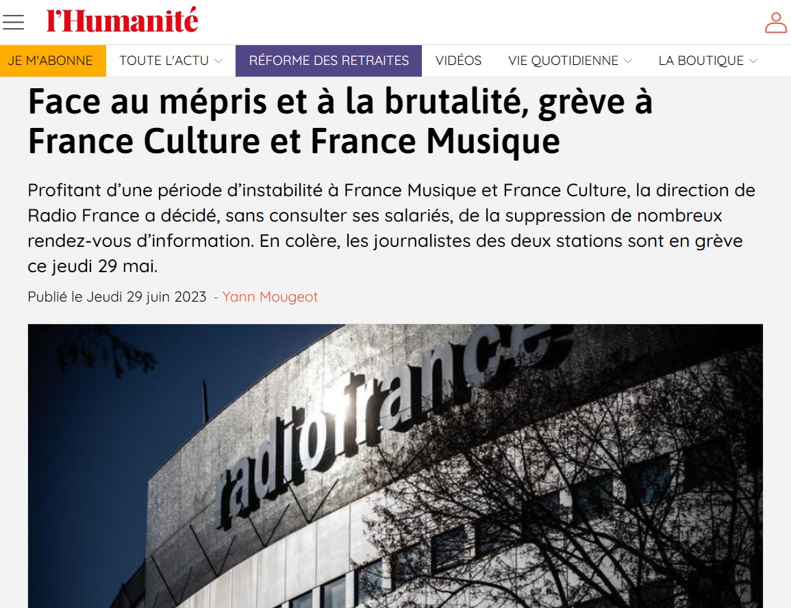 La rédaction d'information de France Musique et de France Culture est en grève pour protester contre l'annonce de la suppression des journaux d'information de la première, et du journal de 22 h pour la seconde. Pourquoi cette décision ? Selon la présidente de Radio France Sibyle Veil, afin de "mettre les moyens d'information à l'heure où le plus de Français nous écoutent". Mais l'un des rares médias à avoir couvert ce mouvement social, l'Humanité, rappelle que cette décision "semble aussi contrevenir au cahier des missions et des charges du groupe public, dont l'article 26 oblige Radio France à «diffuser chaque jour et de manière régulière des bulletins et journaux d'information», sur chacune de ses antennes nationales". Et que la solution envisagée, à savoir y diffuser des journaux des autres antennes de Radio France, aura pour résultat une réduction de la diversité médiatique interne au groupe public. "Notre projet c'est justement de proposer une information différente, sans faits divers, sans polémiques, sans résultats sportifs… ", expose ainsi un journaliste anonyme à l'Humanité. Sans oublier un autre fait : France Culture et France Musique sont les deux radios les mieux captées de France, y compris dans les déserts radiophoniques.
